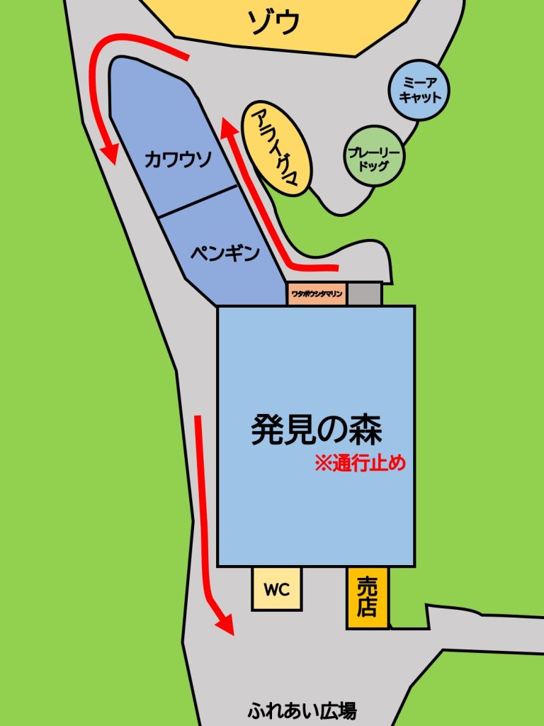 施設整備のため、発見の森は2月24日(火)・25日(水)の2日間、通行止めとなります。そのため、ペンギンとカワウソの展示場裏が順路となります。下記の通り迂回をお願い致します。