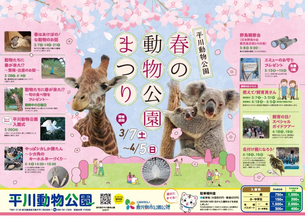 鹿児島市平川動物公園では、3月7日(土)から4月5日(日)まで「春の動物公園まつり」を実施いたします。春にちなんだ様々な企画をご用意しておりますので、ぜひお越しください。
