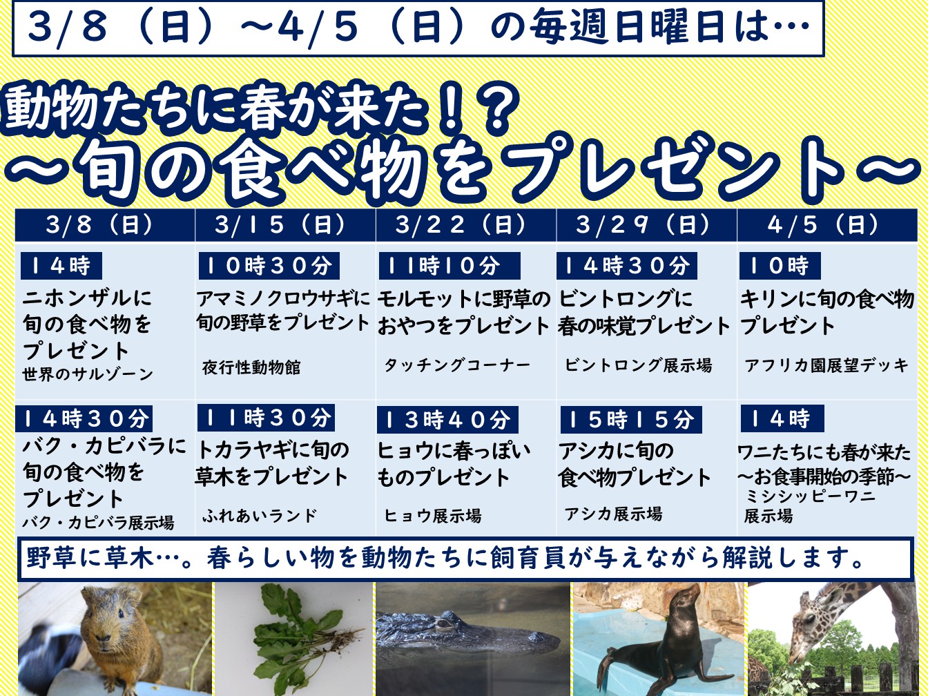 内容:飼育員が動物たちに春ならではの食べ物をプレゼントします。