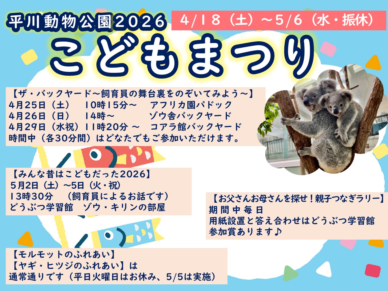 4月29日(水・祝)11時20分 コアラ館バックヤード - 対象 どなたでも 時間内にお越しください。