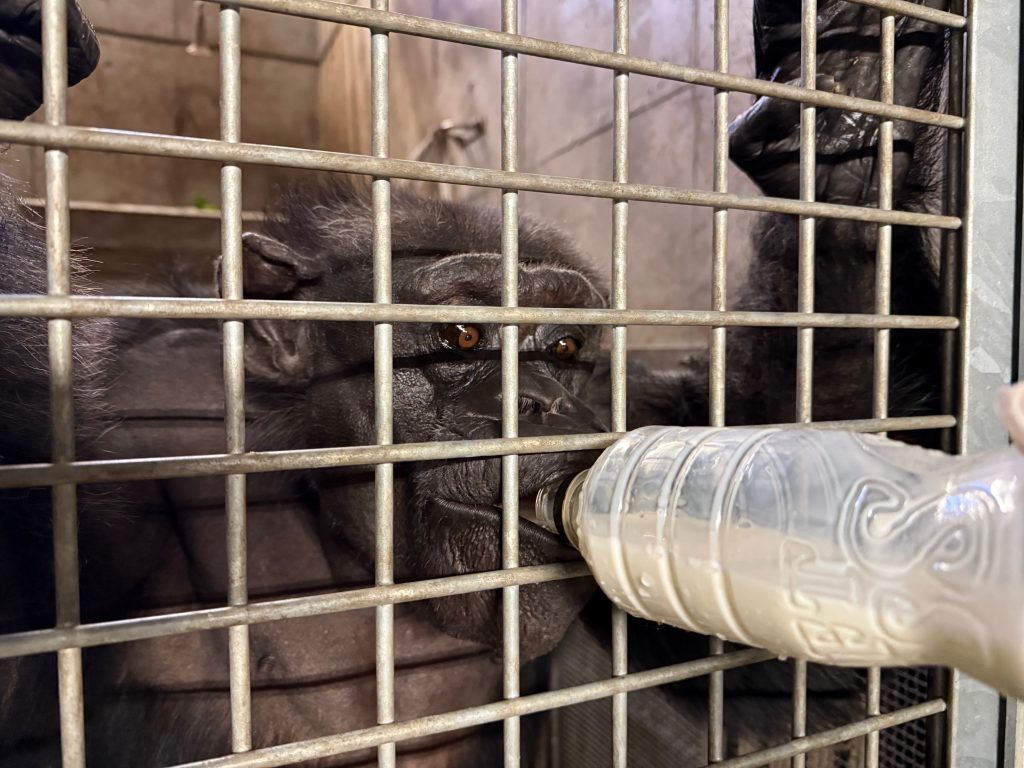 チンパンジーはとても力が強く立派な犬歯や硬い爪を持っているので、少しの接触でも大きな怪我につながる恐れがあります。(万が一の事態に備えて、同居時はスタッフも毎回複数人で対応します)