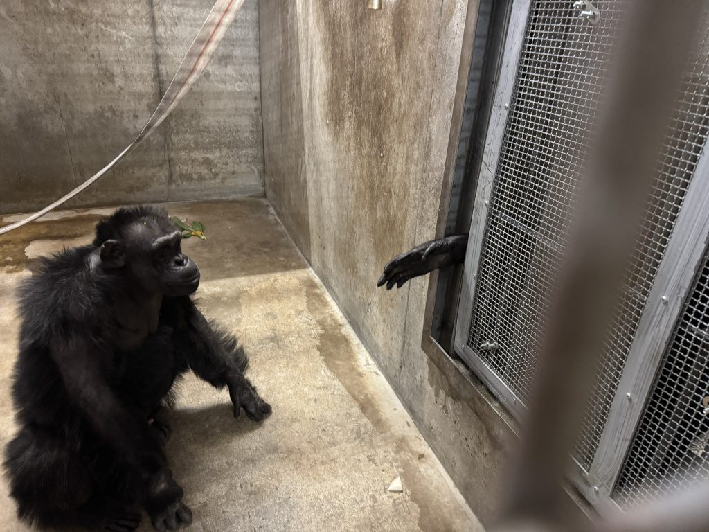 顔合わせ・同居にあたりチンパンジー飼育関係者で事前に話し合った結果、セオリー通りに進めるなら、通常はαオスと新規個体を最初に顔合わせ・同居をすることでαオスを新規個体の味方につけ、他のメンバーからの攻撃などからも守ってもらえるようにした方が良いだろうとのことでした。また、αオスと新規個体が一緒にいるのを先住メンバーに見せることで、αオスが新規個体を認めたなら仕方ないか…と思わせることも出来るだろうという見立てです。