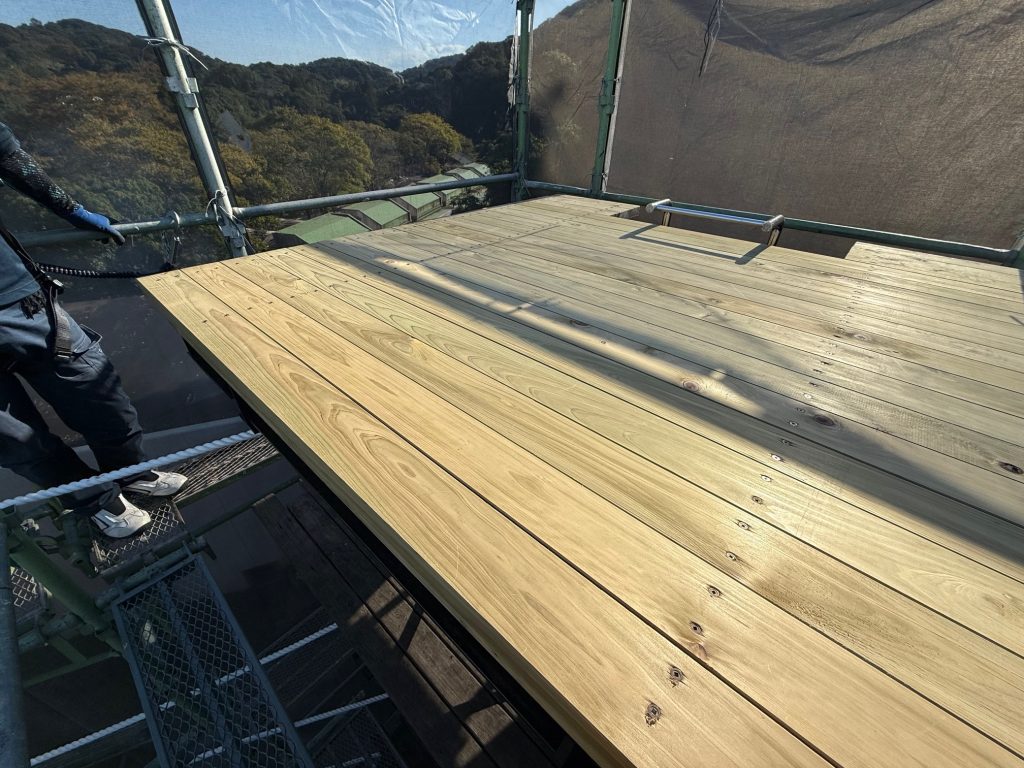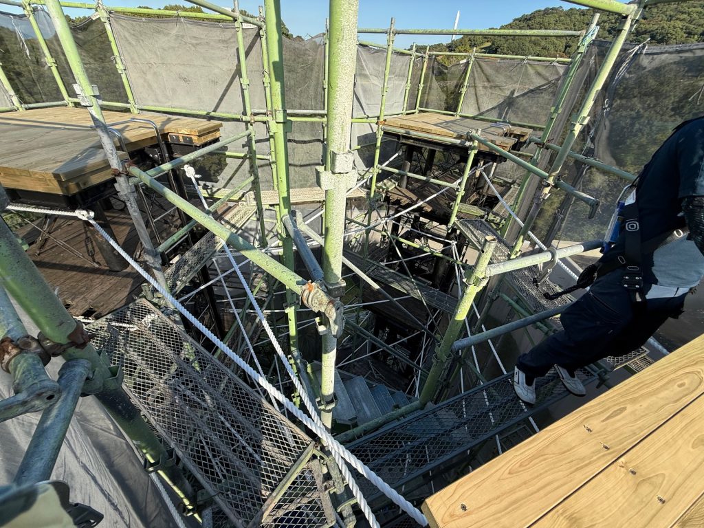10月27日から11月13日まで2週間少々、屋外運動場タワーデッキ最上部の板の張替えとロープを全て交換するため、足場を組んだ大掛かりな工事が始まりました。