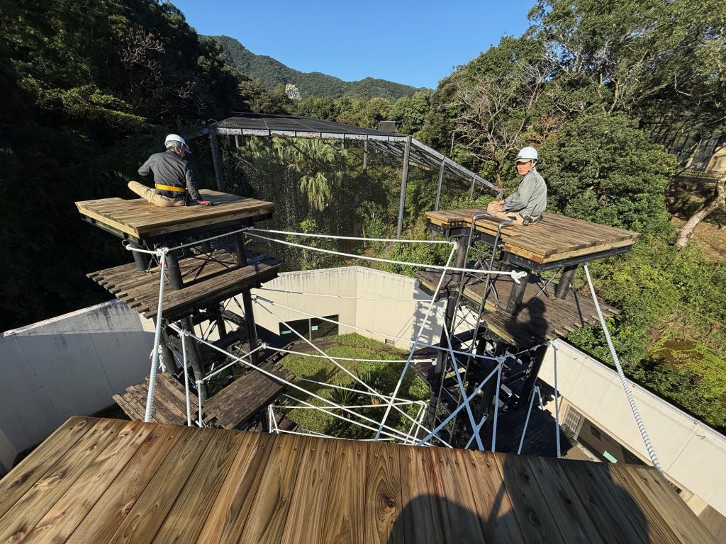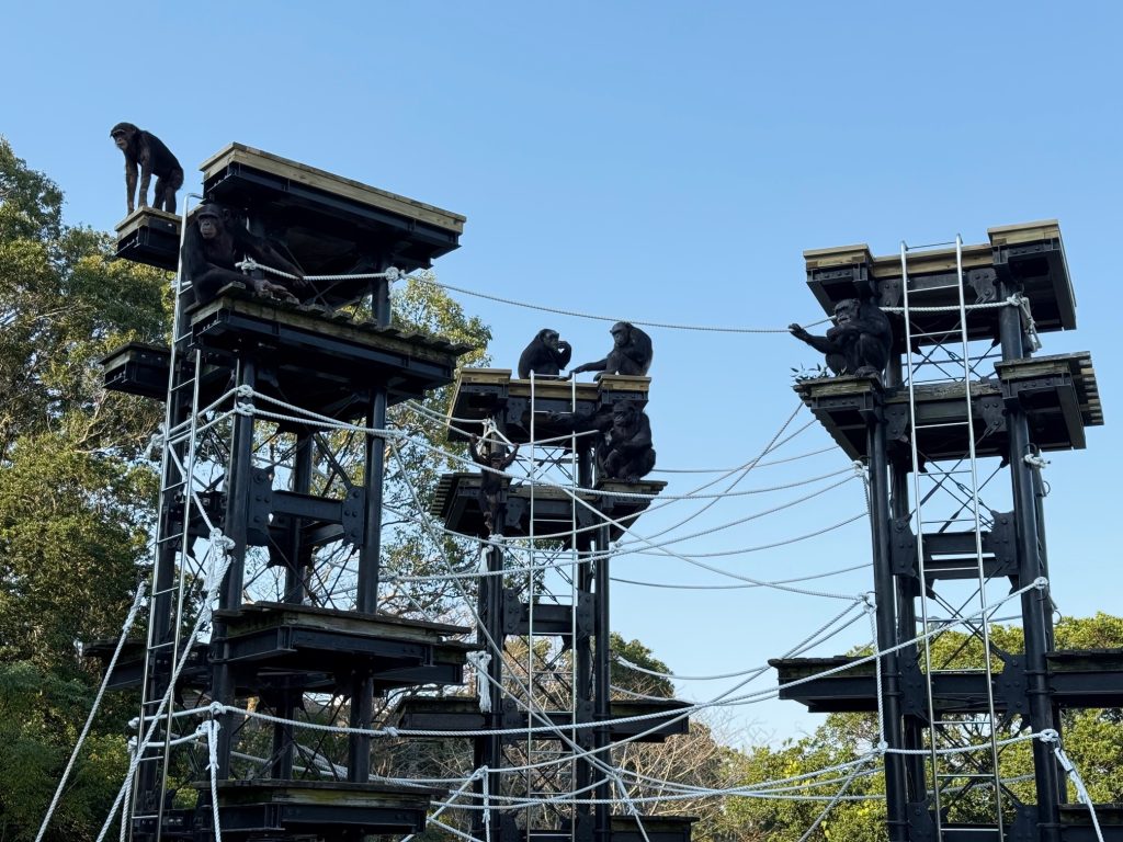 工事の際にタワーの最上部まで登って、普段チンパンジーたちの見ている景色を改めて見てみたのですが、遠くまで周囲の様子を360度見渡せることも、ひとつのエンリッチメントかもしれないなぁと思いながら、チンパンジーと同じ景色を見ていました。