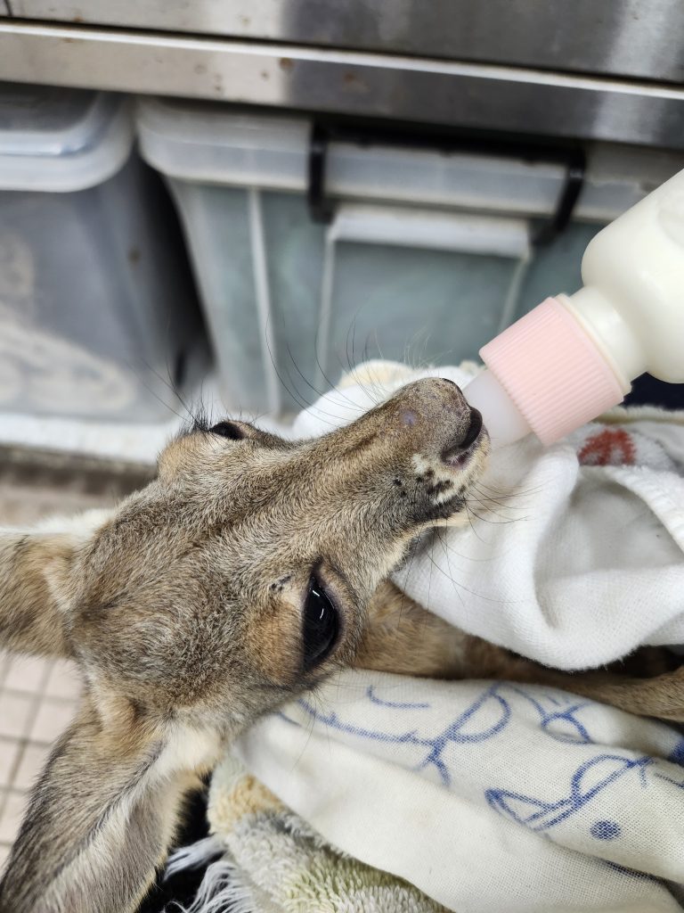 授乳は1日6回から始め、日中は獣医が、朝と夜は飼育担当者が与えることにしました。ミルクは犬用ミルクを使い、哺乳器で与えました。