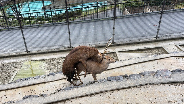 10月にハナジカの袋角が剥けて角が完成し、シカ舎では繁殖期が到来しました!